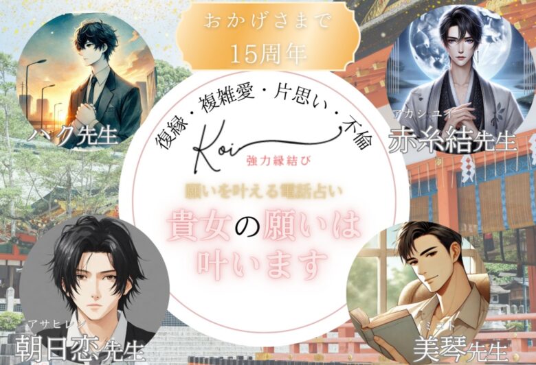 「電話占いKOI」は創業15周年を迎える老舗サイトで、復縁・複雑愛・片思いなど恋愛相談に特化した占い師が多数在籍しています。厳選された鑑定師が集結していて、赤糸結びやツインレイ、思念伝達などの専門的な鑑定が受けられるのが大きな魅力。